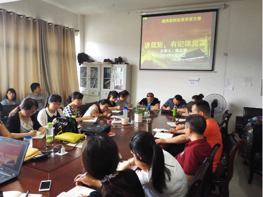 6月14日下午,湘西职院经贸系党支部以专题党课的形式,开启了“两学一做”第二阶段“讲规矩,有纪律”学习教育活动。党课以“讲规矩,有纪律”为主题,由党支部书记张正君主讲,支部全体党员参加了此次活动。