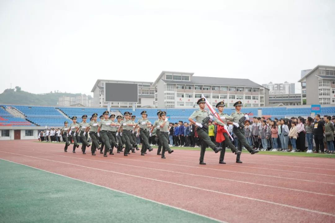 早上7:30,师生们准时在运动场整齐列队,以庄严肃穆的精神面貌静候仪式开始。“前进!”随着教官一声令下,国旗护卫队员手擎钢枪,迈着刚健有力的步伐,整齐划一的动作,激昂雄浑的气势,护卫五星红旗进场,行进到国旗杆下。随后,雄壮有力的国歌响彻了整个体育场,师生们行注目礼,共唱国歌,看着鲜艳的五星红旗冉冉升起。歌声唤起了对先辈的缅怀,点燃了师生强烈的爱国热情。