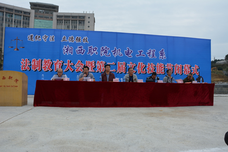 10月13日下午,机电工程系在演艺广场成功举办了以“做遵纪守法学生,建平安系部和平安班级”为主题的法制教育大会暨第二届文化技能节闭幕式。学院党委委员、工会主席陈杨晖,保卫处处长高继明受邀出席会议,湘西经济开发区公安分局湾溪派出所警官宿秀权为1800余师生作专题法制教育讲座。大会由机电系副主任姚茂华主持。