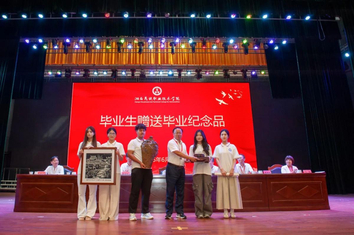 随后的活动中,全体毕业生右手抚胸,庄严诵读《职教青年誓言》,承诺“以技能服务社会,不负时代使命”。校领导为毕业生代表颁发毕业证书及优秀毕业生证书。毕业生代表向学校赠送纪念品,表达对母校的深厚情谊,谢绍猛代表学校接受了这份纪念品