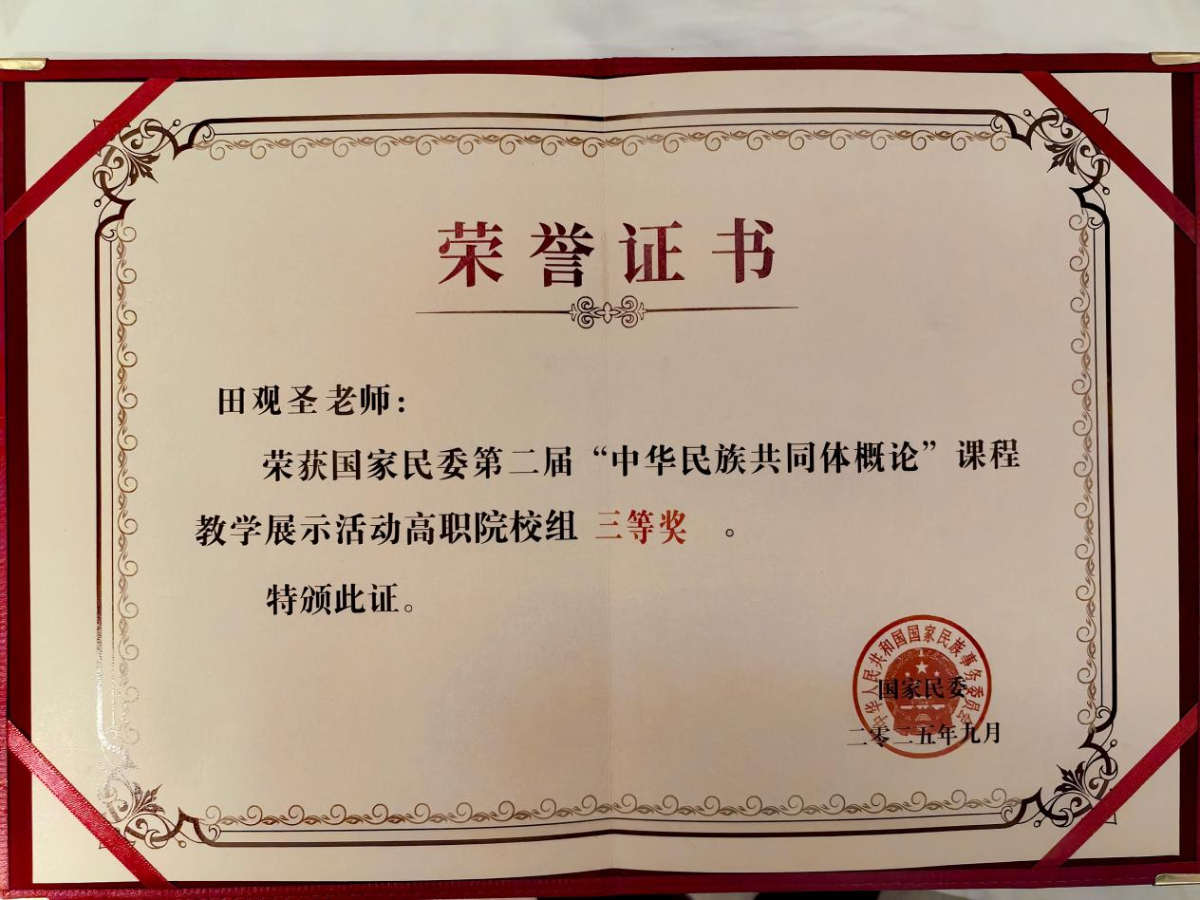 近日,由国家民族事务委员会主办、教育部协办、中南民族大学承办的第二届“中华民族共同体概论”课程教学展示活动在武汉圆满落幕。我校旅游管理学院辅导员、《中华民族共同体概论》教研室主任田观圣老师在高职院校组现场教学展示中表现优异,荣获三等奖,为学校争得荣誉。