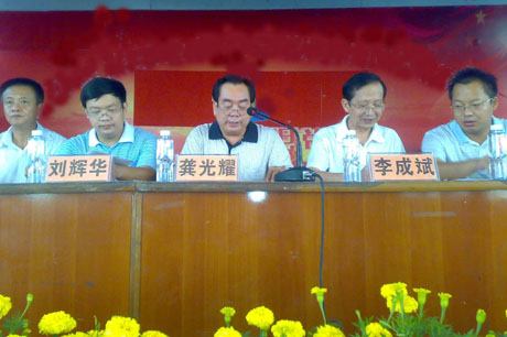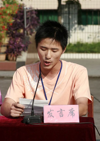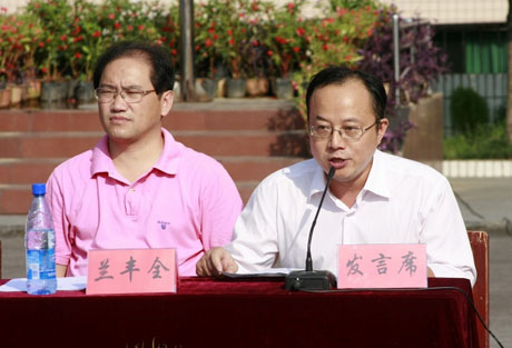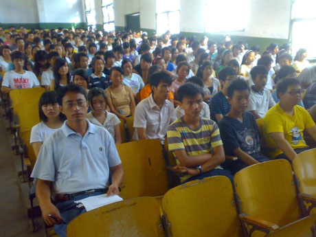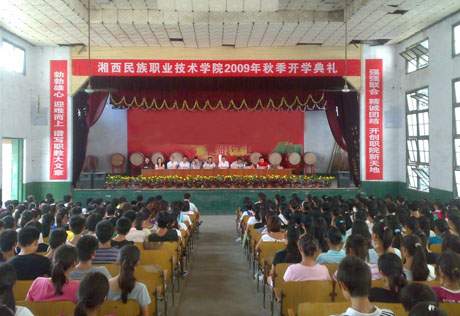 丹桂飘香,金秋送爽, 8月19日上午,学院分别在南校区及技工学校校区同时举行了2009级初中起点新生开学典礼。在庄严的国歌声中,开学典礼拉开了帷幕。会上,学院领导介绍了学校的发展情况,并对学生的在校学习生活提出了几点殷切希望,希望同学们努力提高自身思想政治素质,努力提高自身专业技能,努力提高自我管理能力,努力培养主人翁精神。与会的教师代表、学生及新生代表均作了热情洋溢的发言,学生处老师就开学期间入学教育、军训等事宜作了具体安排。学院领导龚光耀、李成斌、宋清华、杨建平、陈杨晖、曾文光等在主席台上就座,各系主任及部分处室负责人参加了会议。