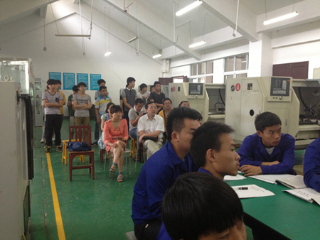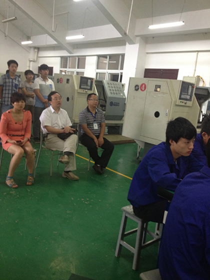 为进一步推进专业规划与产业发展、课程标准与行业标准、教学过程与生产过程的高效对接,提高数控加工技术专业(州级精品专业)的建设质量,6月15日,机电工程系数控教研室黄毅、段征育、黎桂平三位教师在实训楼C101上了一堂理论与实践相结合的台阶轴类零件加工一体化示范课。州人社局项目建设专家彭顺孝,学院教务处处长毛国及该系系主任罗燕、部分教师现场指导和观摩。