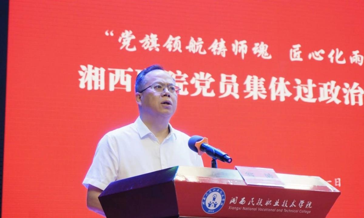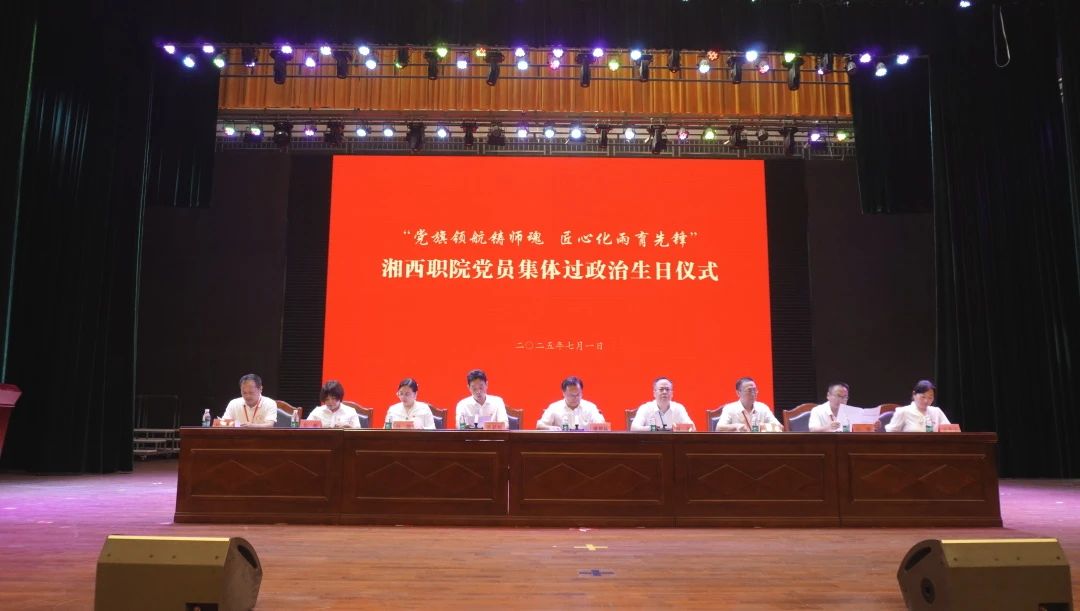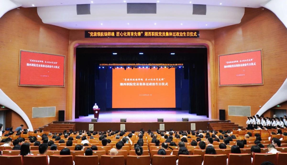 为庆祝党的104周年华诞,今天上午,湘西民族职业技术学院“党旗领航铸师魂 匠心化雨育先锋”党员集体过政治生日仪式在文体会展中心展示馆举行。学校党委书记谢绍猛出席活动并为全体党员上专题党课,党委副书记、校长翁波主持活动。学校党委班子成员、教职工党员和学生党员、预备党员以及部分退休党员代表参加本次活动。