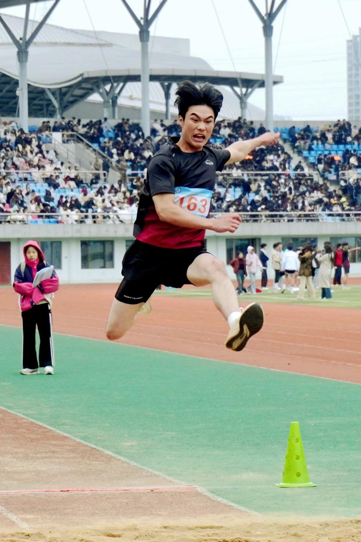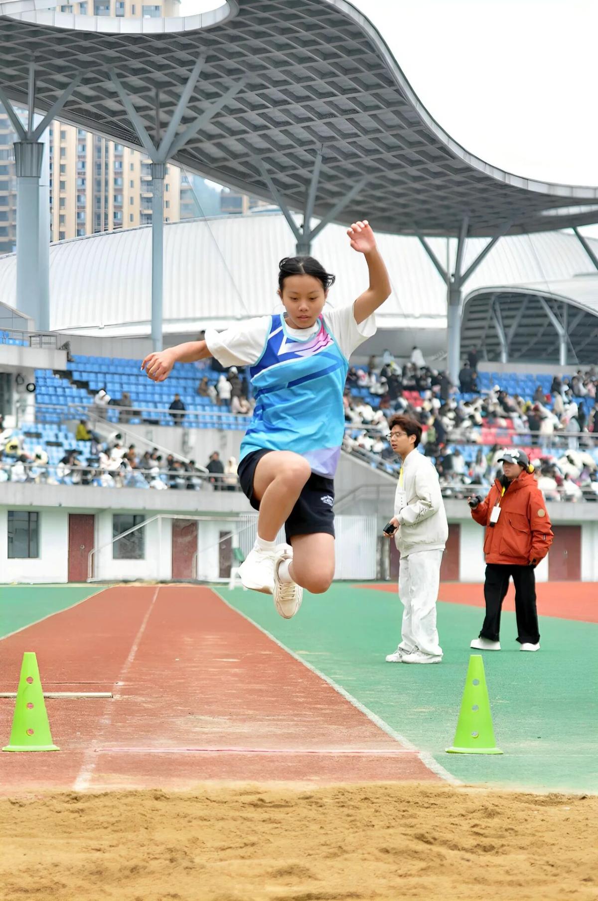 赛场上,短跑运动员们如离弦之箭,步伐有力、目光坚定,奋力冲向终点;长跑选手则用毅力对抗疲惫,以专注消解压力,用行动诠释着坚持的意义。跳远和跳高运动员轻盈跃起,在空中划过优美的弧线——落地的那一刻,把拼搏的姿态定格在赛场上。实心球从手中掷出,力量在半空中化作一道有力的轨迹;接力赛一棒传一棒,默契配合,传递的是信任,更是团结。
