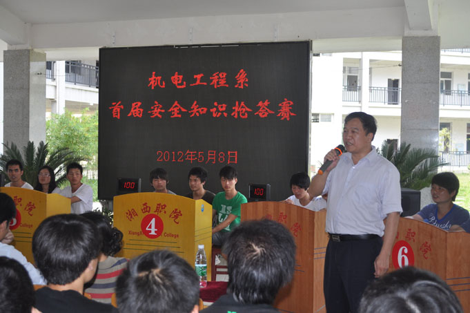 5月8日下午,一场主题为“学习安全知识、强化安全意识”的安全知识抢答赛在学院教学楼一楼大厅举行。本次竞赛由学院机电工程系主办。学院党委书记吴正有、副院长宋清华出席比赛现场,副院长宋清华为比赛活动致辞。州安监局副局长刘登桃应邀观看比赛。