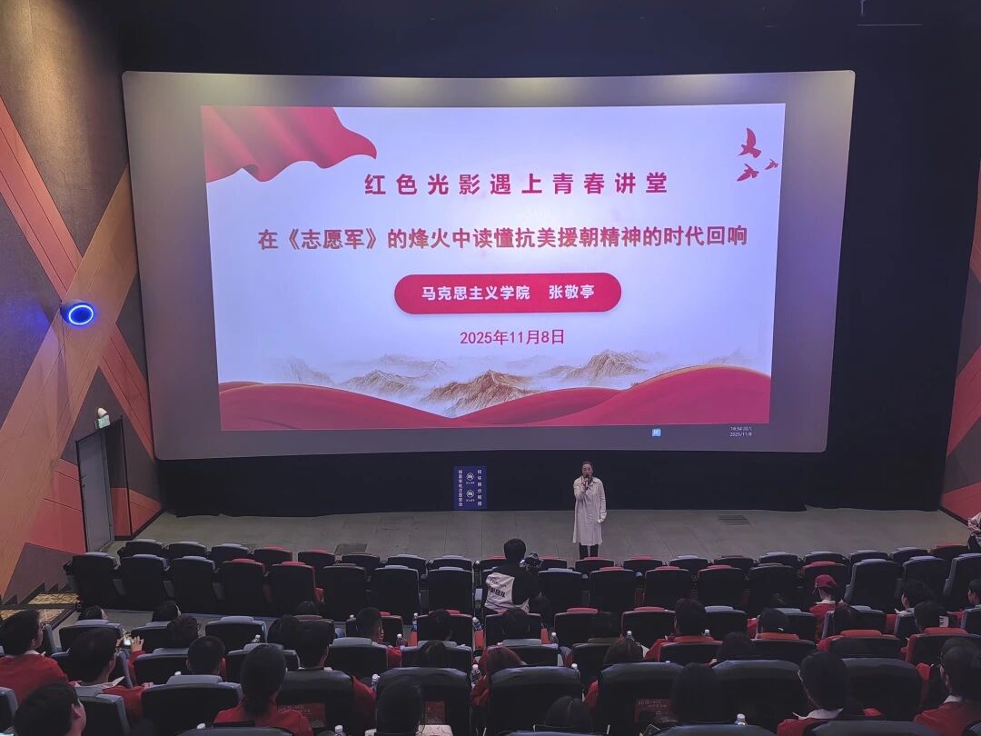 当日下午,培训以“红色光影+青春讲堂”的形式开展移动思政课。学员在嘉逸国际影城集中观看了红色电影《志愿军:浴血和平》,观影后,马克思主义学院副院长张敬亭讲授《从光影到灵魂:在〈志愿军〉的烽火中读懂抗美援朝精神的时代回响》专题思政课。