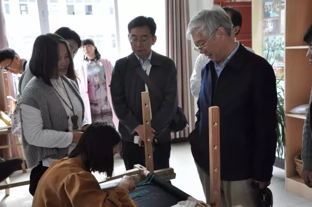 调研组在谭吉慧书记陪同下参观了学院民族艺术系师生民族工艺品、服装设计作品陈列馆和土家织锦、苗绣、蜡染等民族工艺传习所。在工艺美术大师叶水云的工作室,调研组听取了叶老师对土家织锦技艺的介绍并参观了学生作品,对学院开展的“非遗文化进课堂”项目给予了高度评价。