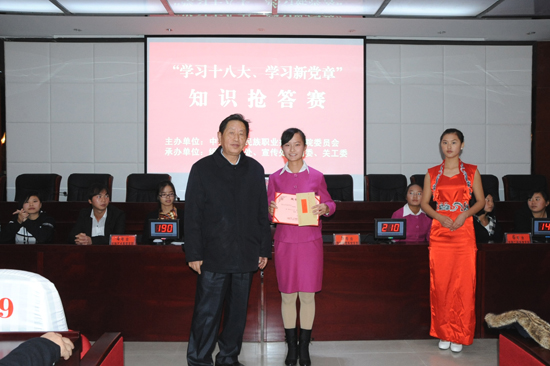 为了深入学习贯彻党的十八大精神,加强学院团员青年对新党章知识的了解,11月26日下午,我院在教学楼D区多功能会议厅举办了学习党的十八大精神和党章知识抢答赛。院党委副书记曹义文,副院长罗红、杨建平,院纪委书记刘修洪,院关工委常务副主任胡和生出席竞赛活动,院党委副书记曹义文为比赛活动致辞。州关工委主任龙爱东,原州政法委副书记宋新情,州直工委委员、办公室主任戴晓军应邀观看比赛,并为获奖代表队颁奖。