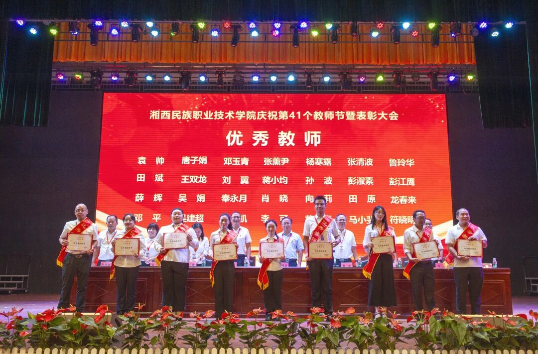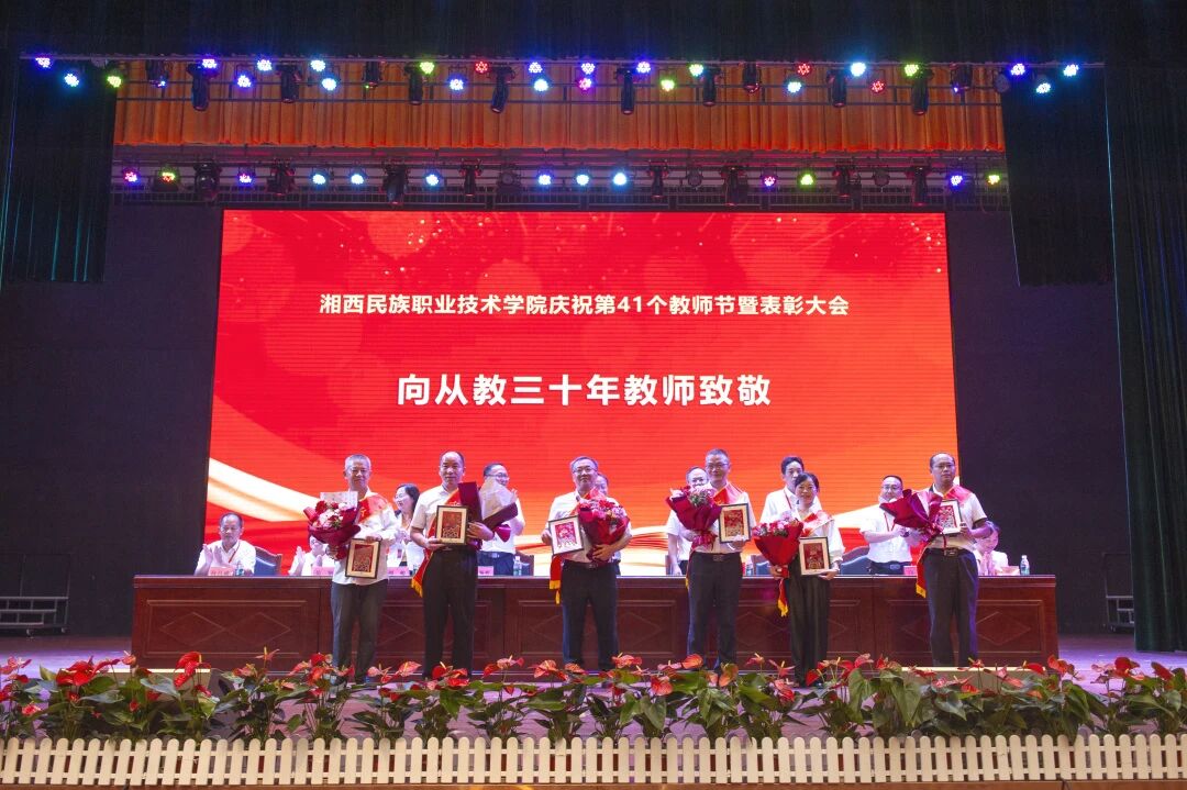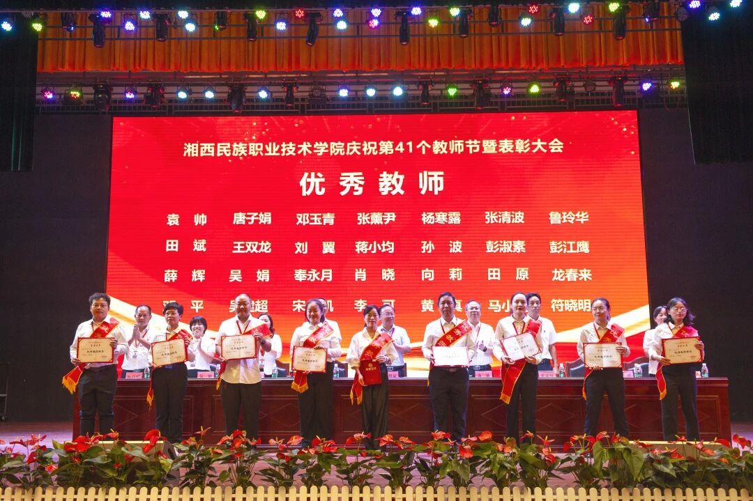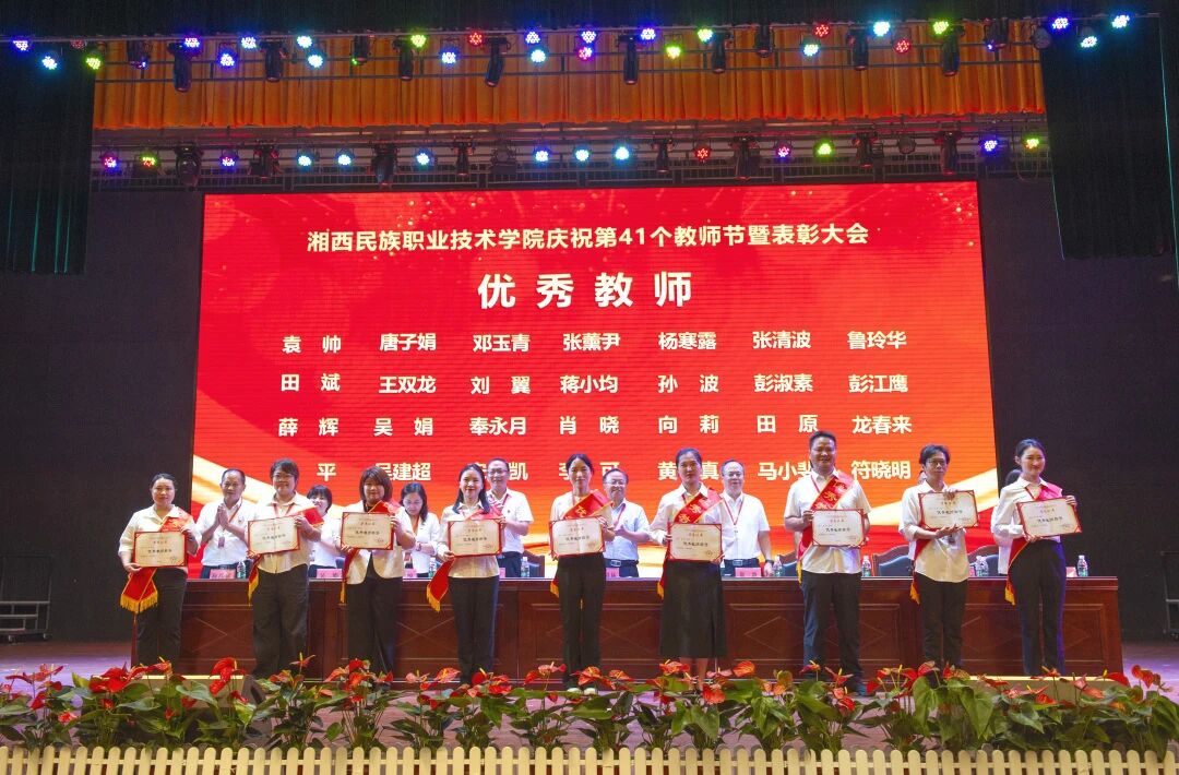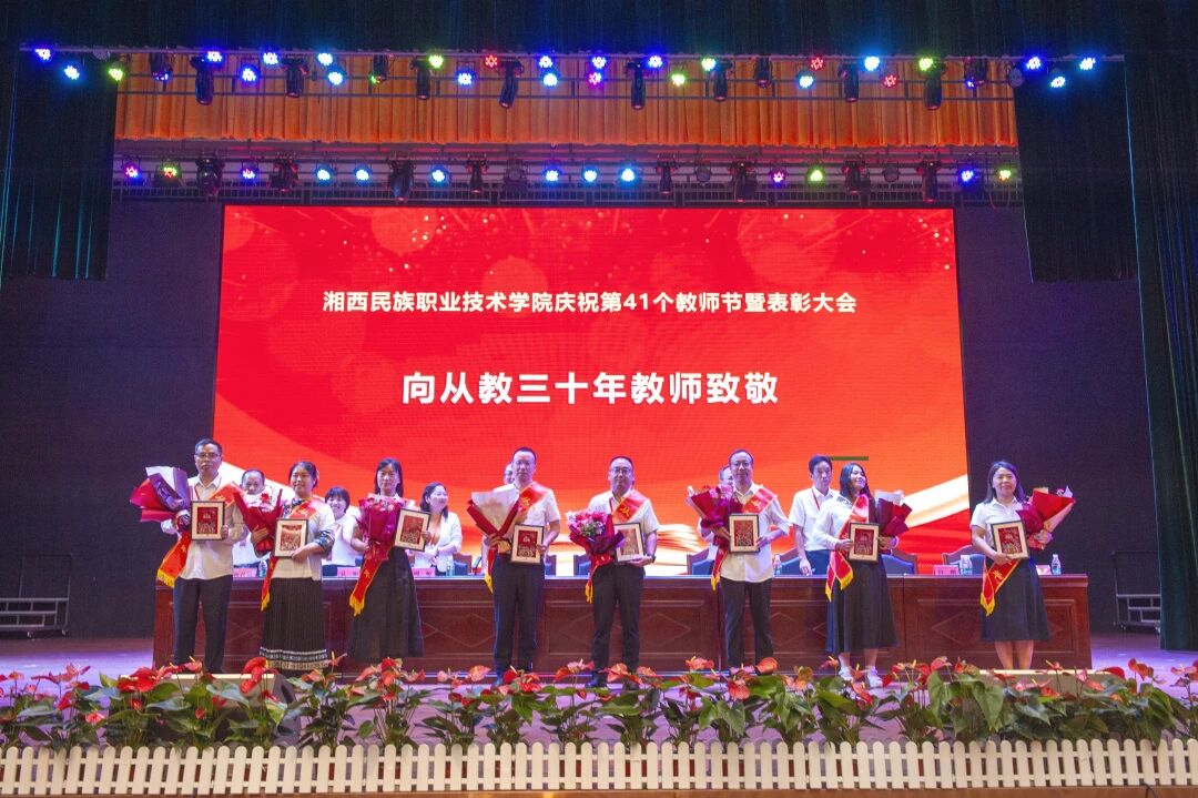 学校党委副书记、副校长陈杨晖宣读了《湘西民族职业技术学院关于表彰2025年度优秀教师等先进个人的决定》。学校党委班子成员现场对28名受表彰的“优秀教师”、5名受表彰的“优秀辅导员”、15名受表彰的“优秀教育工作者”现场进行了颁奖,并向从教三十年教师颁发了纪念品。